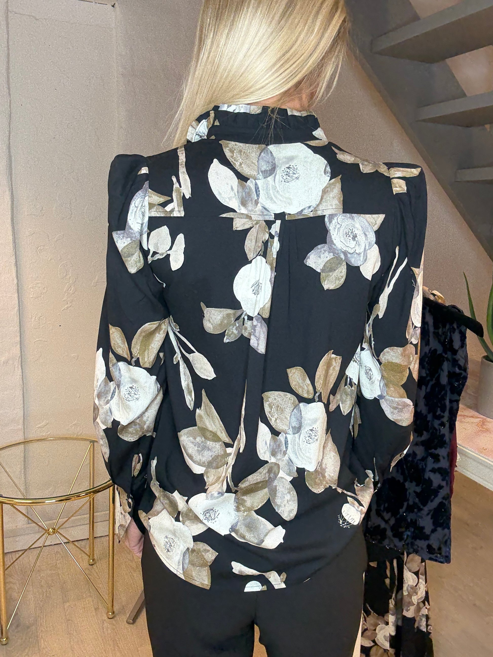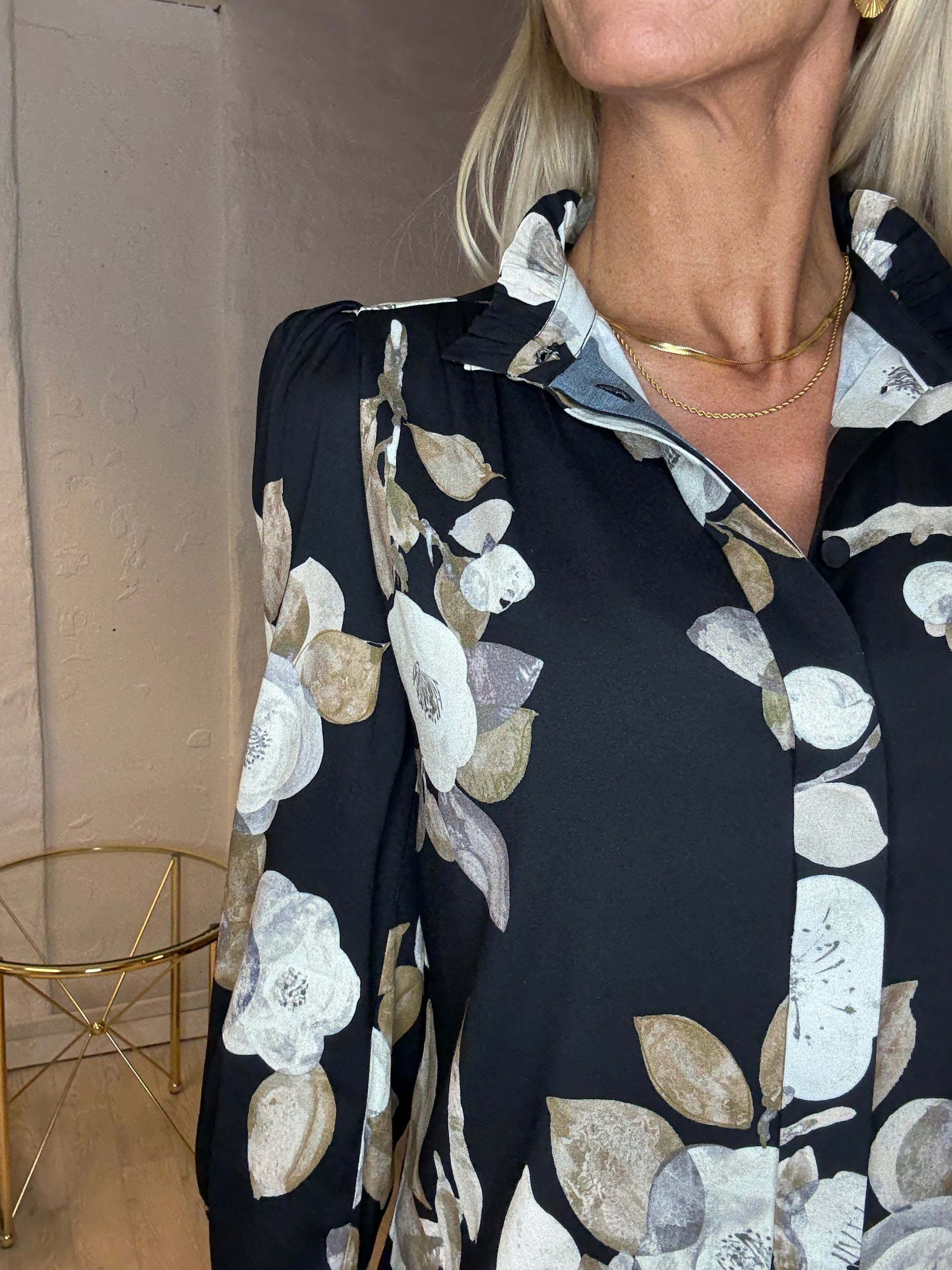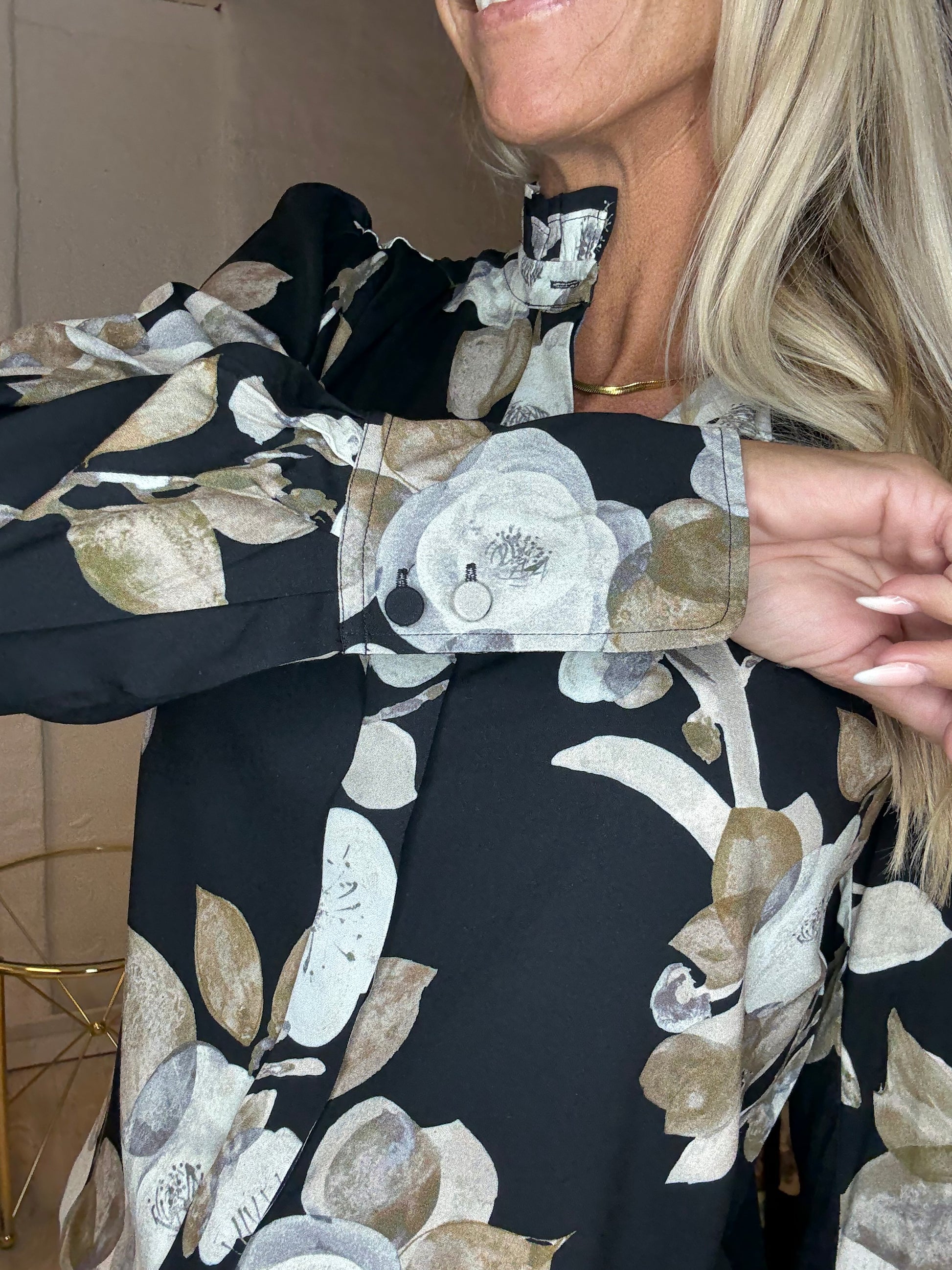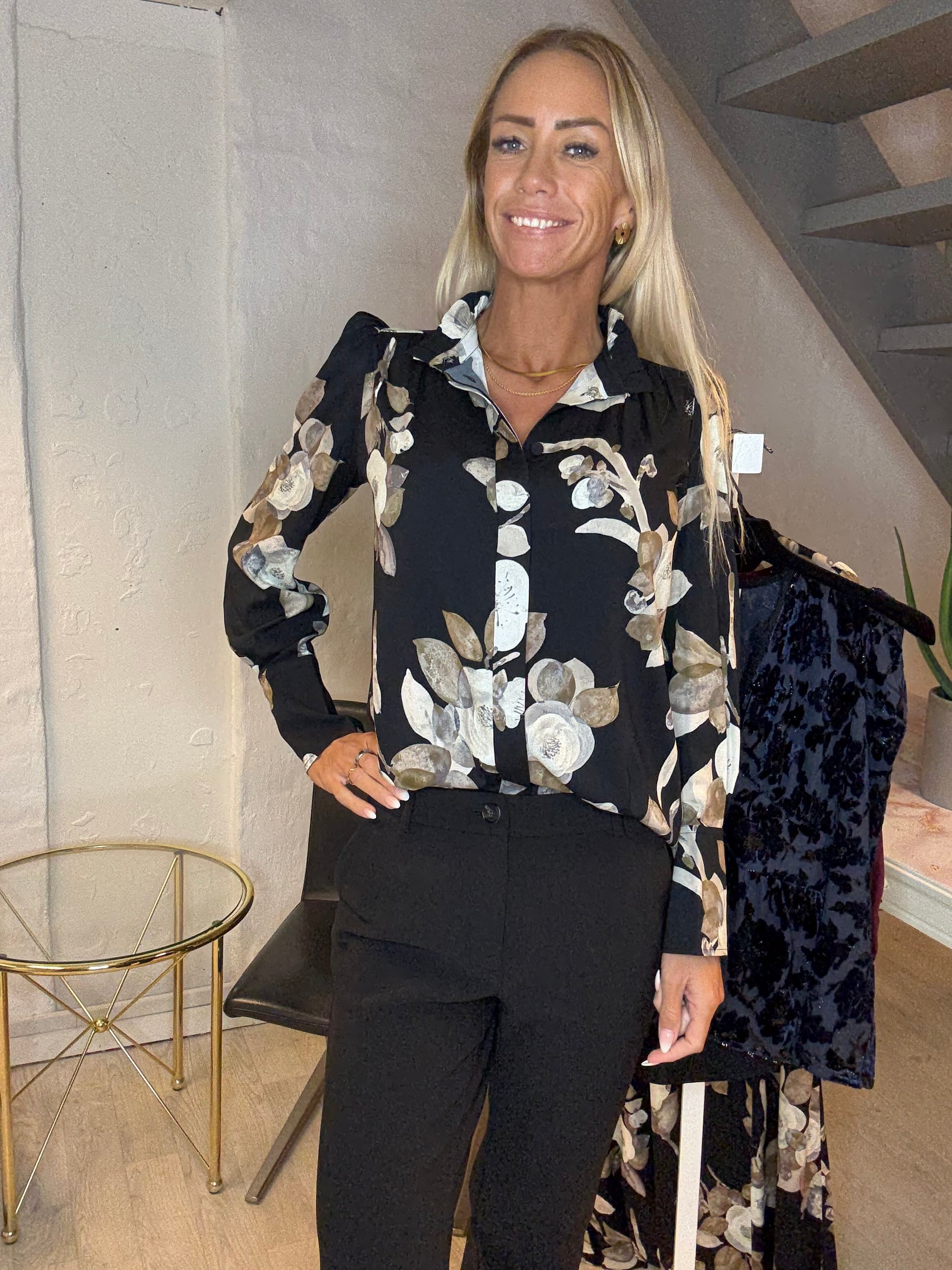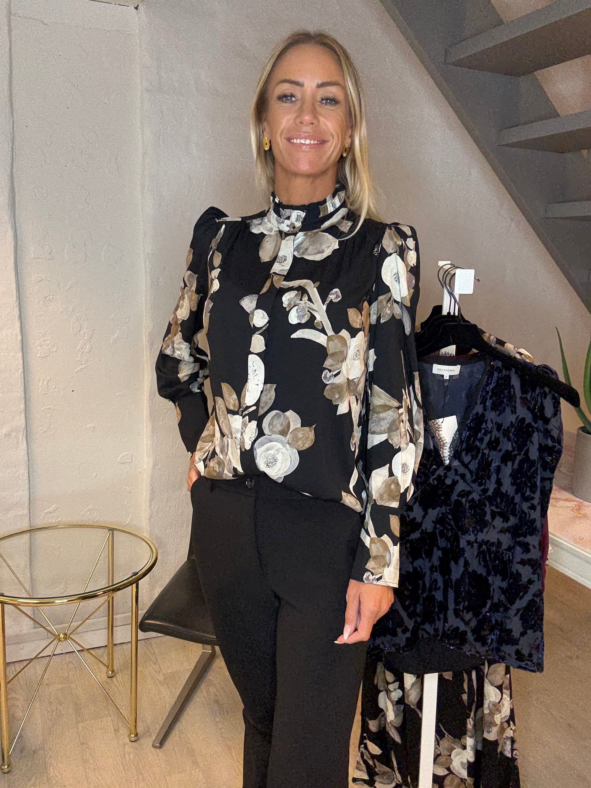 Denne sofistikerede og elegante bluse i brune og sorte nuancer har to flæser, der skaber en standkrave, og betrukne knapper ned langs fronten. Der er små læg i halsen foran og bagpå, og der er aftagelige skulderpuder i samme stof.