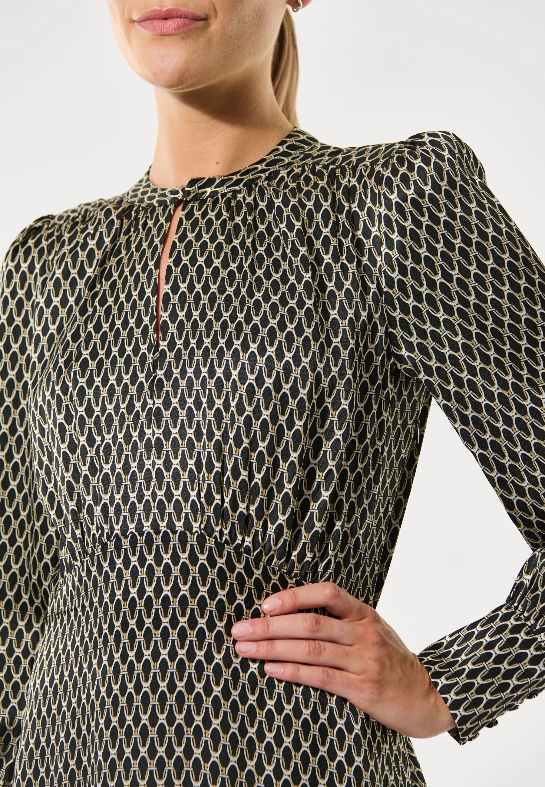 Smuk silkekjole som har en empire-overskæring med små rynk, og en høj taljeoverskæring ligeledes med rynk. Løse ærmer med lille puf og manchet som lukkes med fine betrukne knapper. Bagpå er ligeledes en overskæring med små rynk, som fremhæver lænden på en meget feminin måde, nederst er et bredt flæsestykke. Kjolen kan enten lukkes med en lille knap i halsen eller stå åben hvis du ønsker en V-udskæring.