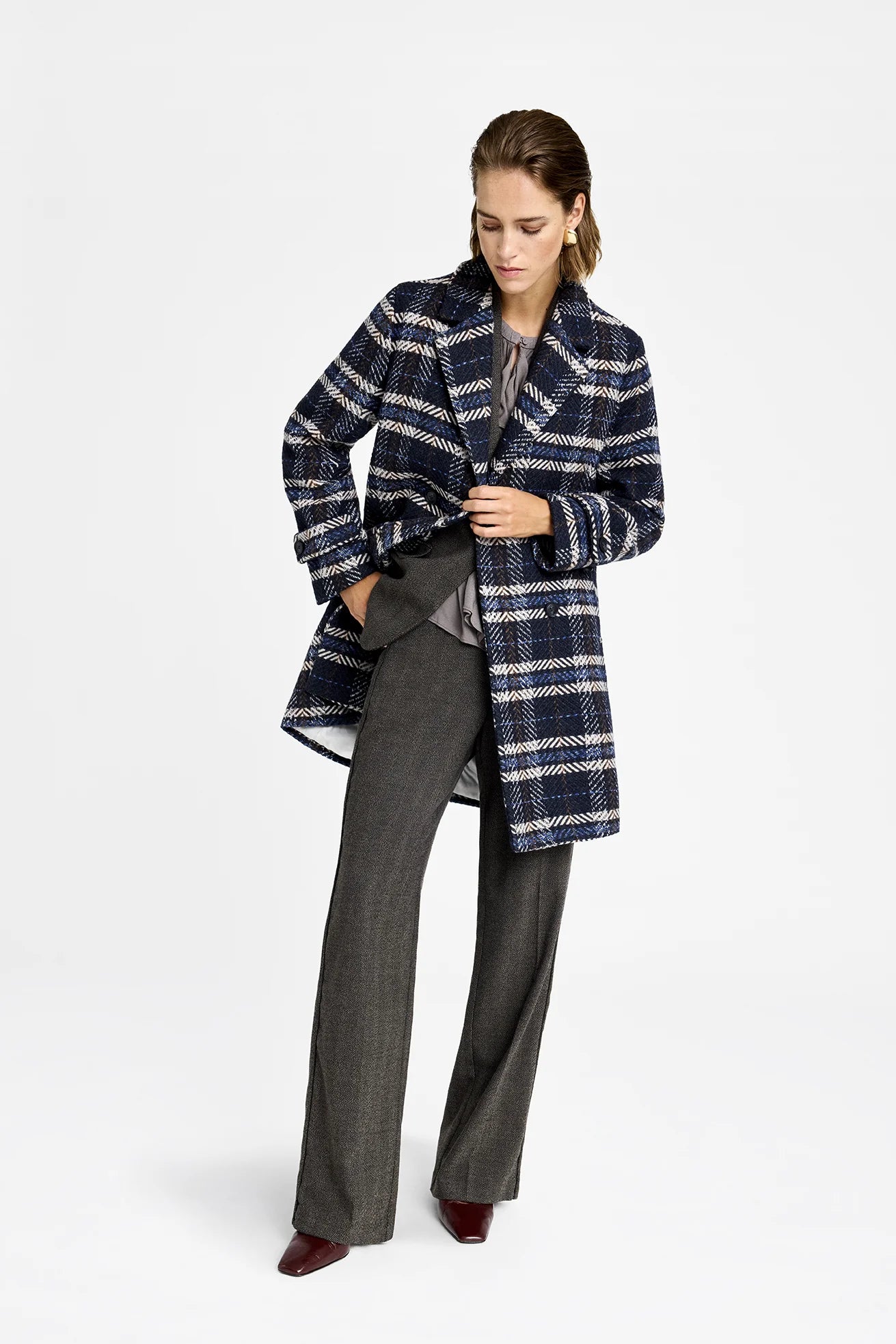 Skøn halvlang ternet Janice uldjakke fra Gustav, designet i en lækker grovvævet uldkvalitet. Jakken har et klassisk snit med stort revers, dobbeltradet knaplukning, skrålommer i siden og stropdetalje med knap på ærmet samt slids forneden