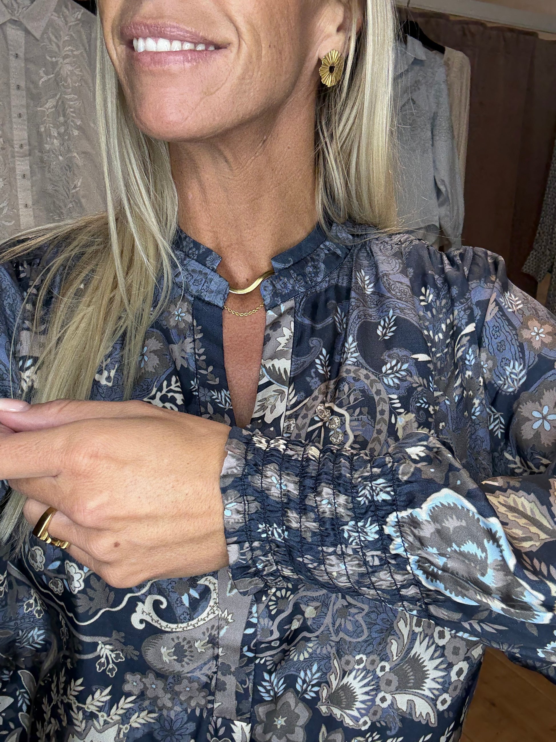 Smuk mørkeblå printet Sikka skjorte fra Gustav, designet i en lækker cuprokvalitet med et fantastisk flot paisleyprint. Skjorten har en lille krave, stolpelukning og lange ærmer med elastikmanchet.