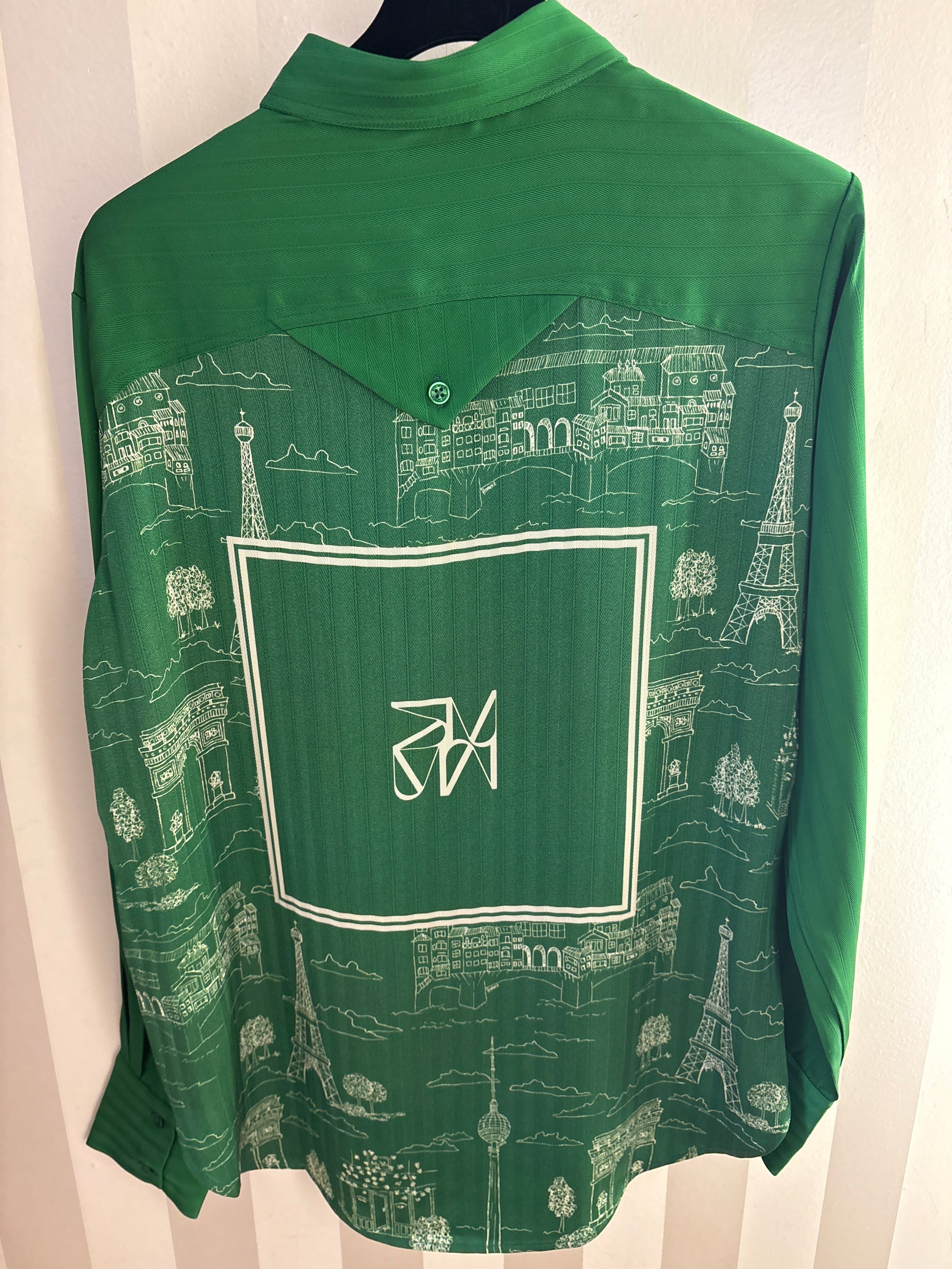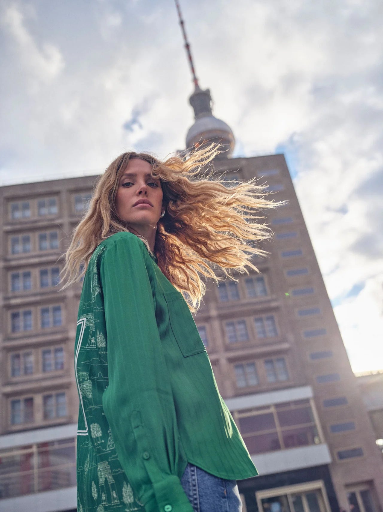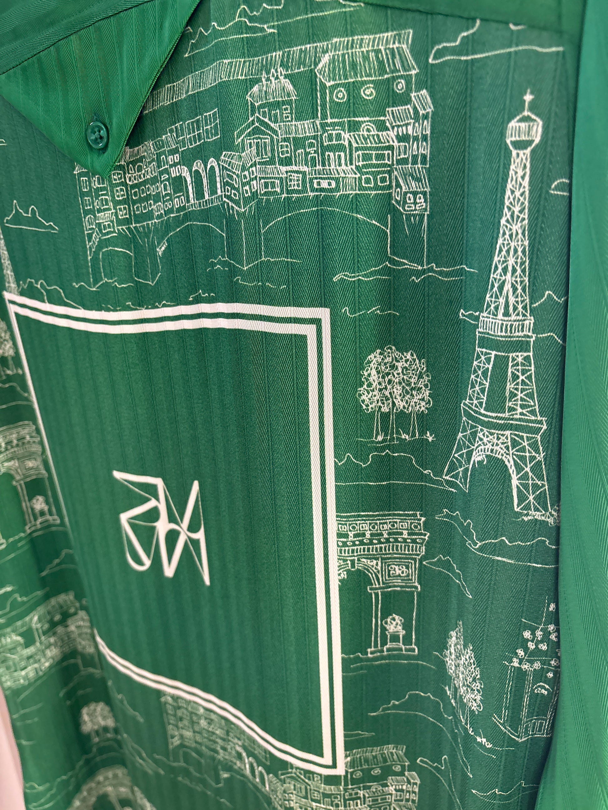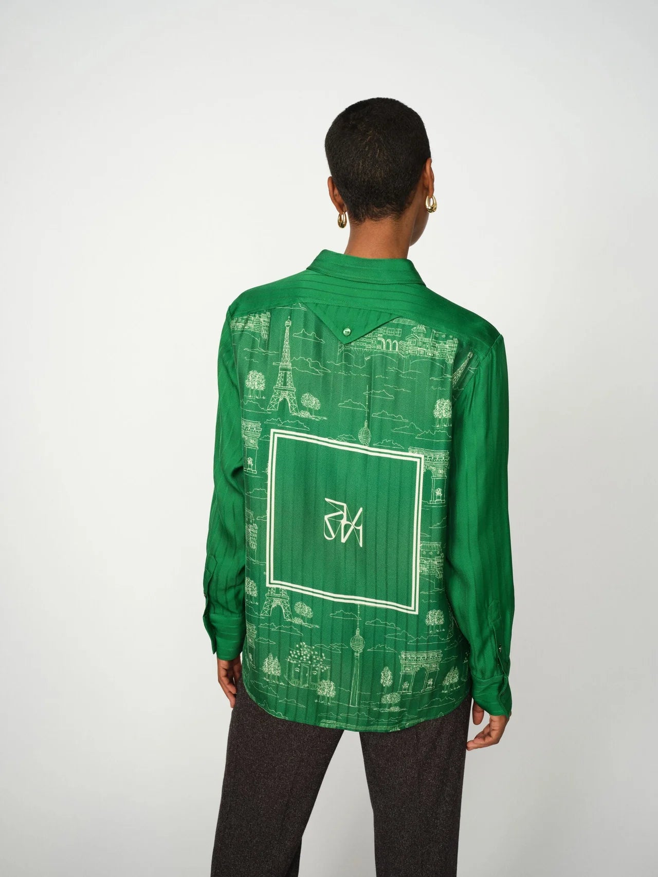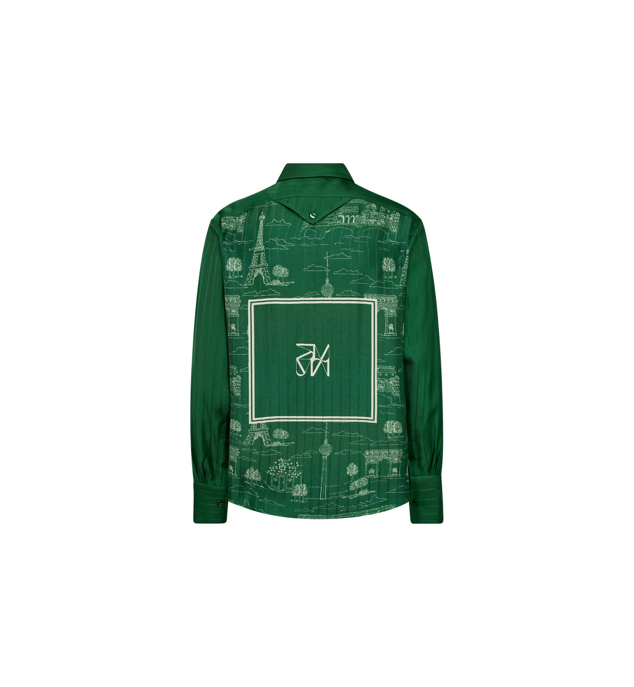 Denne unikke skjorte kombinerer tidløs sofistikation med moderne kunstnerisk flair. Designet i en regulær pasform med klassisk krave og knaplukning, får den et stilfuldt twist med en markant stribet tekstur foran, mens et håndtegnet grafisk design på ryggen hylder ikoniske vartegn fra hele verden. Skjorten har praktiske lommer og lange ærmer, og så forener denne iøjnefaldende skjorte kreativitet med raffineret stil.