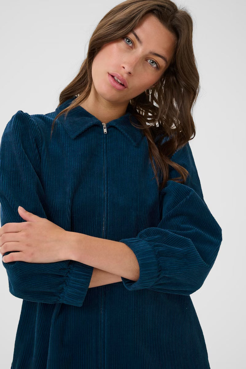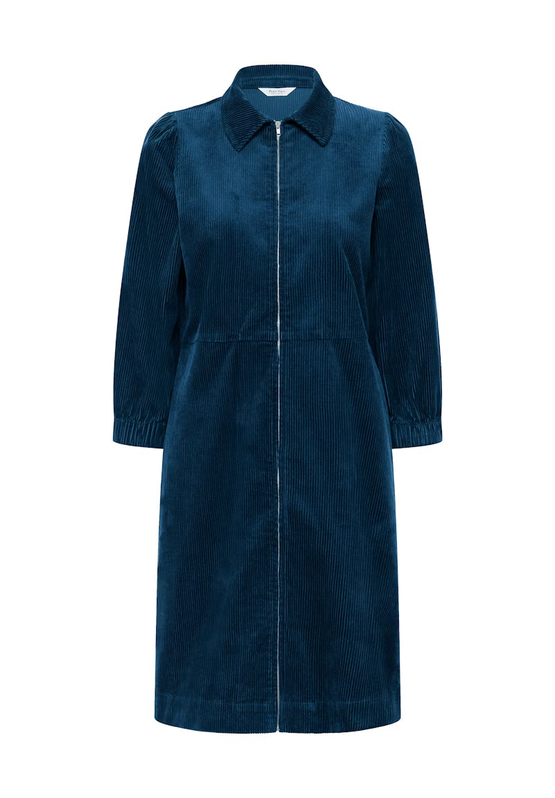 Modellen er 177 cm høj og er iført en størrelse 36. Denne fløjlsbeklædte kjole kombinerer et klassisk snit med en moderne kant. Den har en praktisk lynlåslukning, en elegant krave og 3/4-ærmer med elastiske manchetter. Det bløde materiale gør den behagelig at have på, og den er perfekt til både hverdag og festlige anledninger.