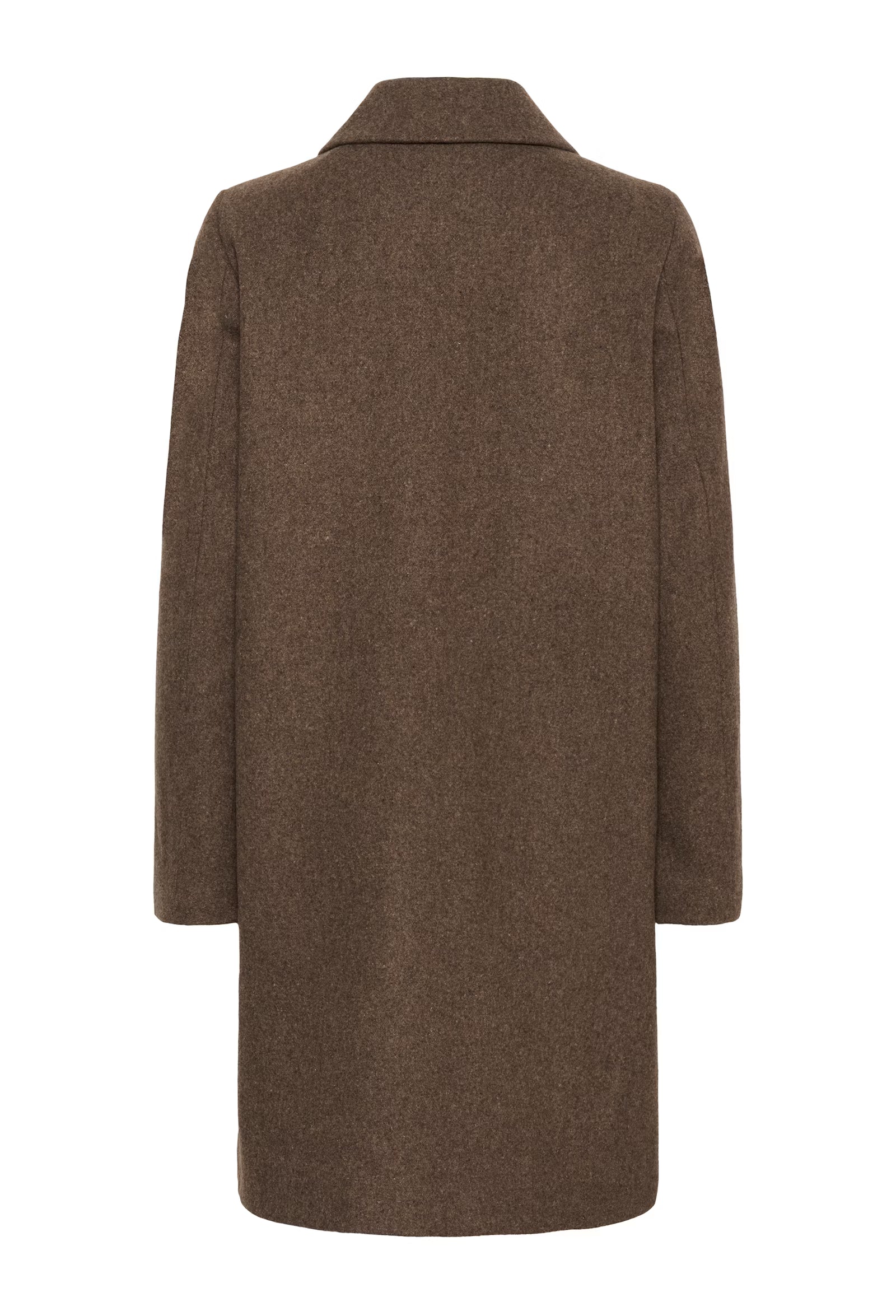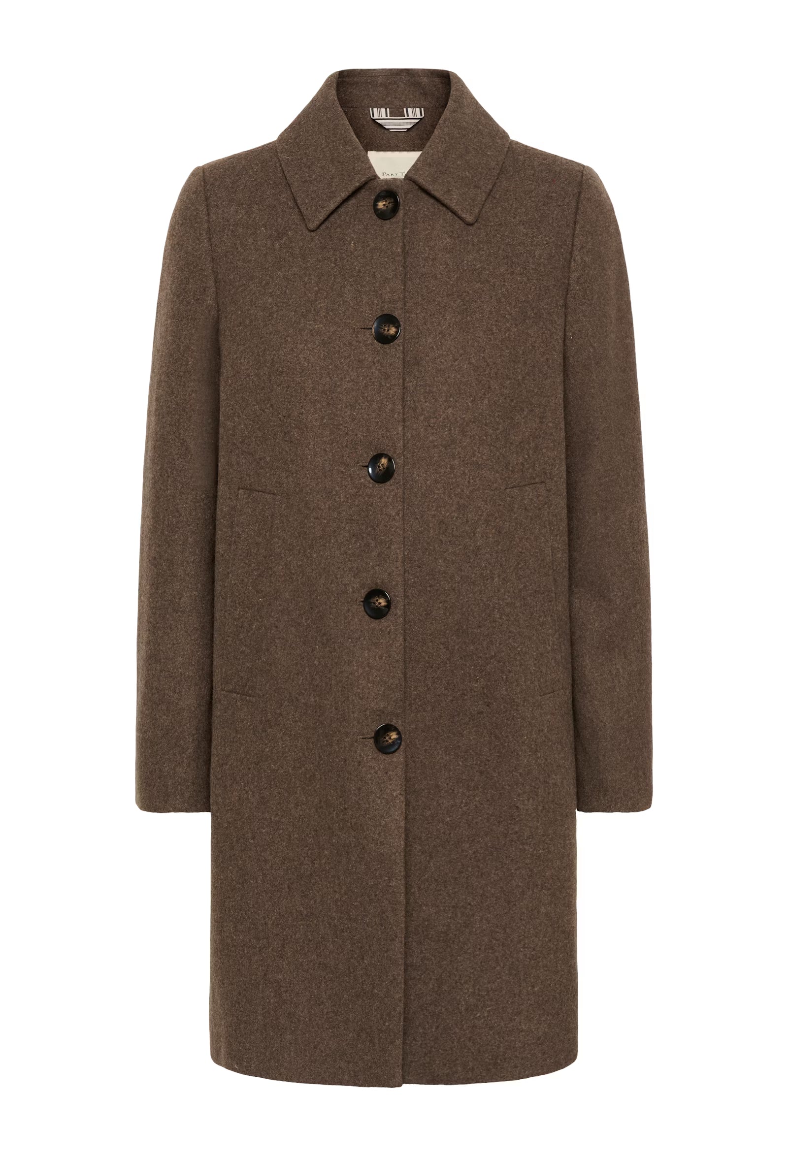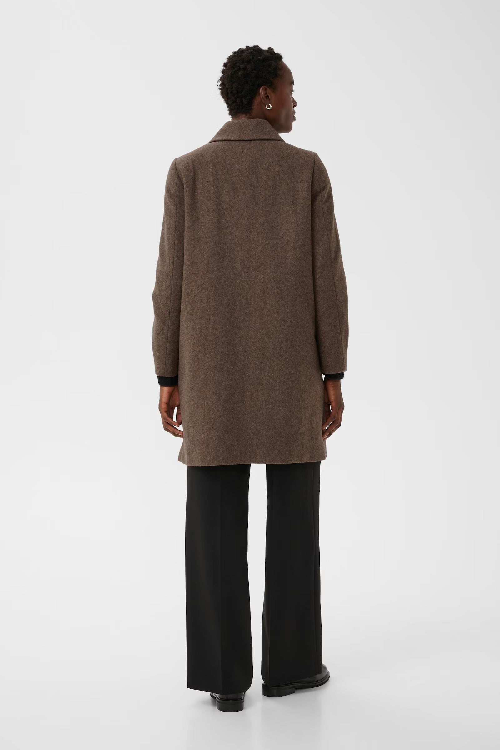 Modellen er 180 cm høj og er iført en størrelse 36. En tidløs uldfrakke med en ren og struktureret silhuet. Designet med klassisk krave, knaplukning og diskrete sidelommer, der kombinerer elegance og varme. Det minimalistiske design gør den til en alsidig garderobeklassiker, perfekt til både hverdags- og sofistikerede looks.