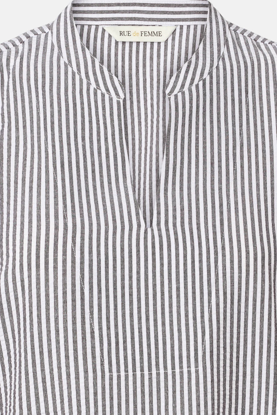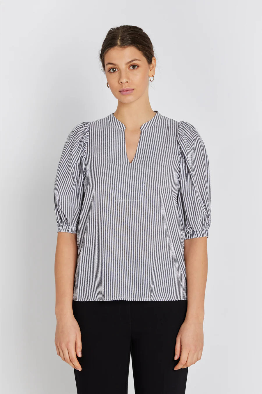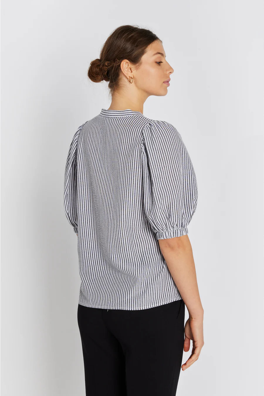 7740RDFArmelle bluse har et afslappet snit med V-udskæring og diskret stribemønster, der tilfører et let og feminint præg.