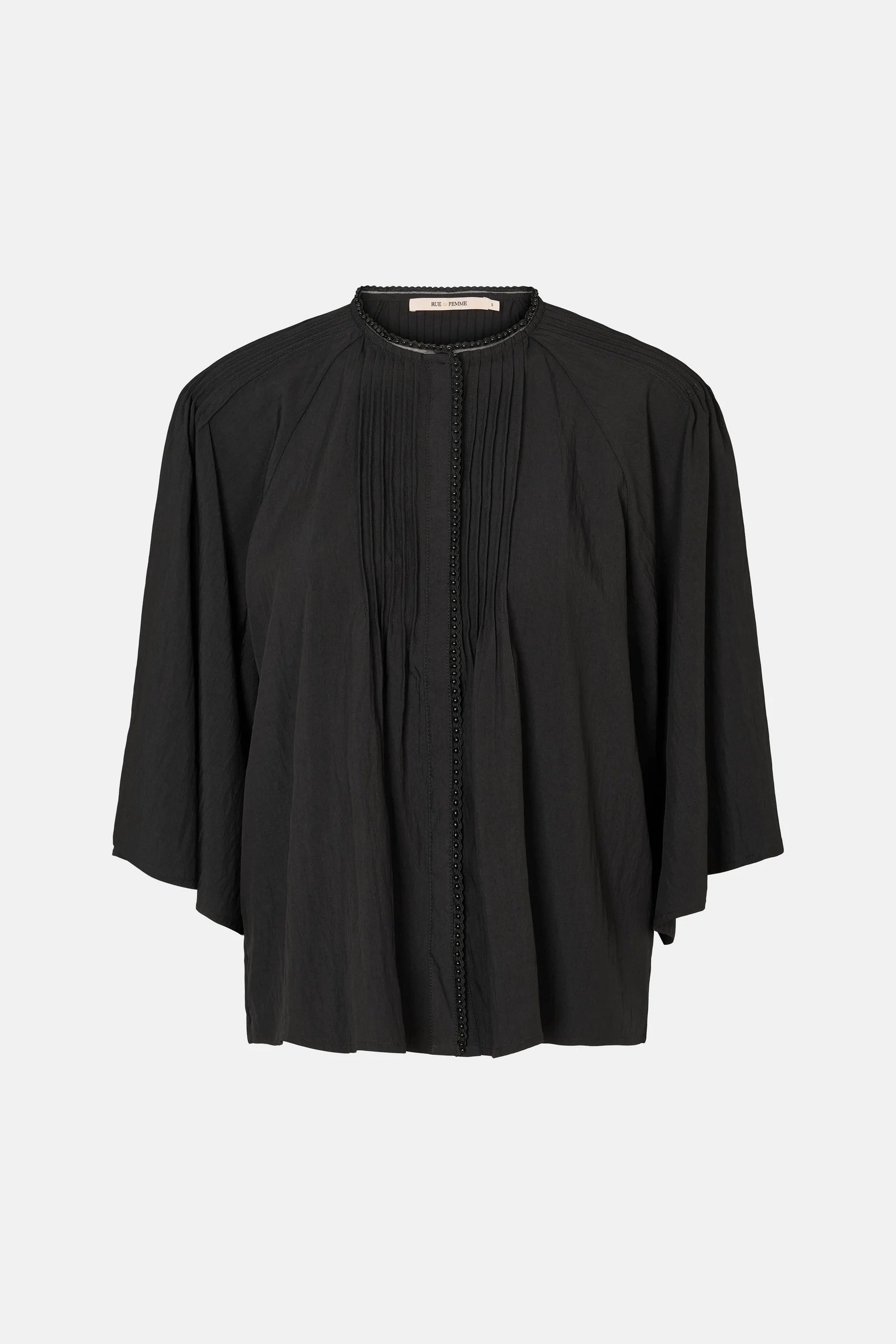 Kassia er en feminin skjorte med løs silhuet, brede trekvartærmer og fine læg foran og bagpå.