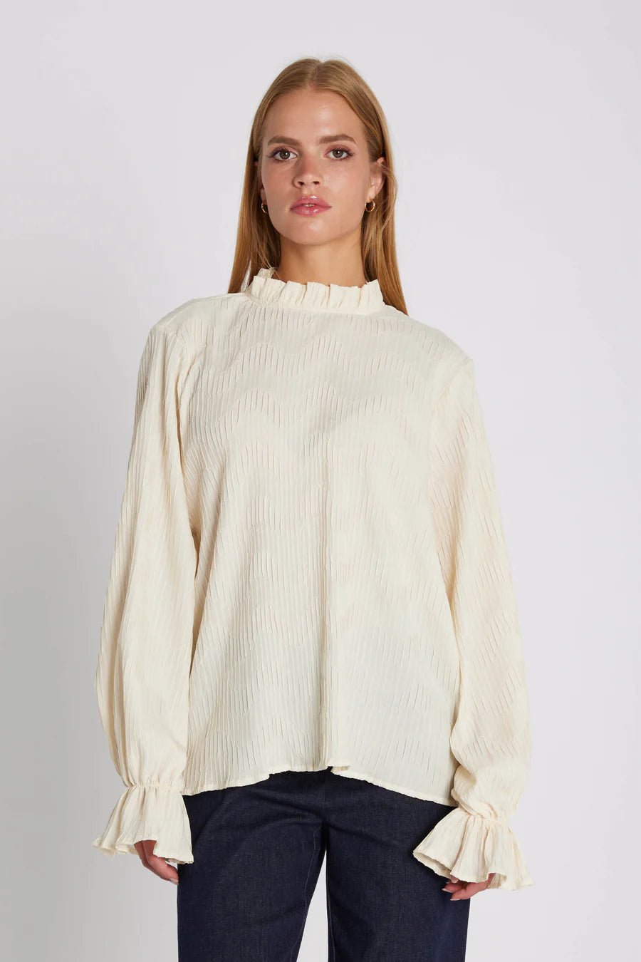 Helena er en elegant bluse med rynket struktur og feminine flæsedetaljer i hals og ærmekanter.