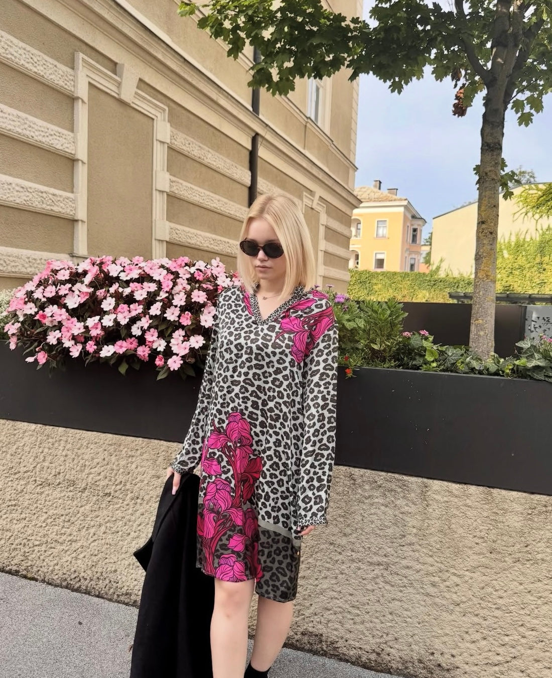 Smuk let og feminin kort kjole i flotte farver, meget behagelig mod huden.