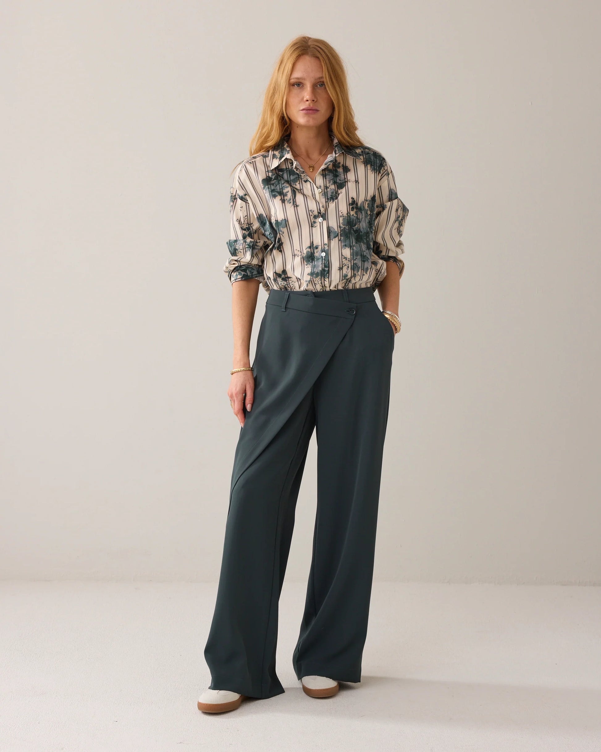 Løstsiddende skjortebluse med et rigt print af blomster og striber. Blusen har en sænket skuldersøm og justerbare manchetter. Bagsiden er længere end forsiden med en afrundet bund.