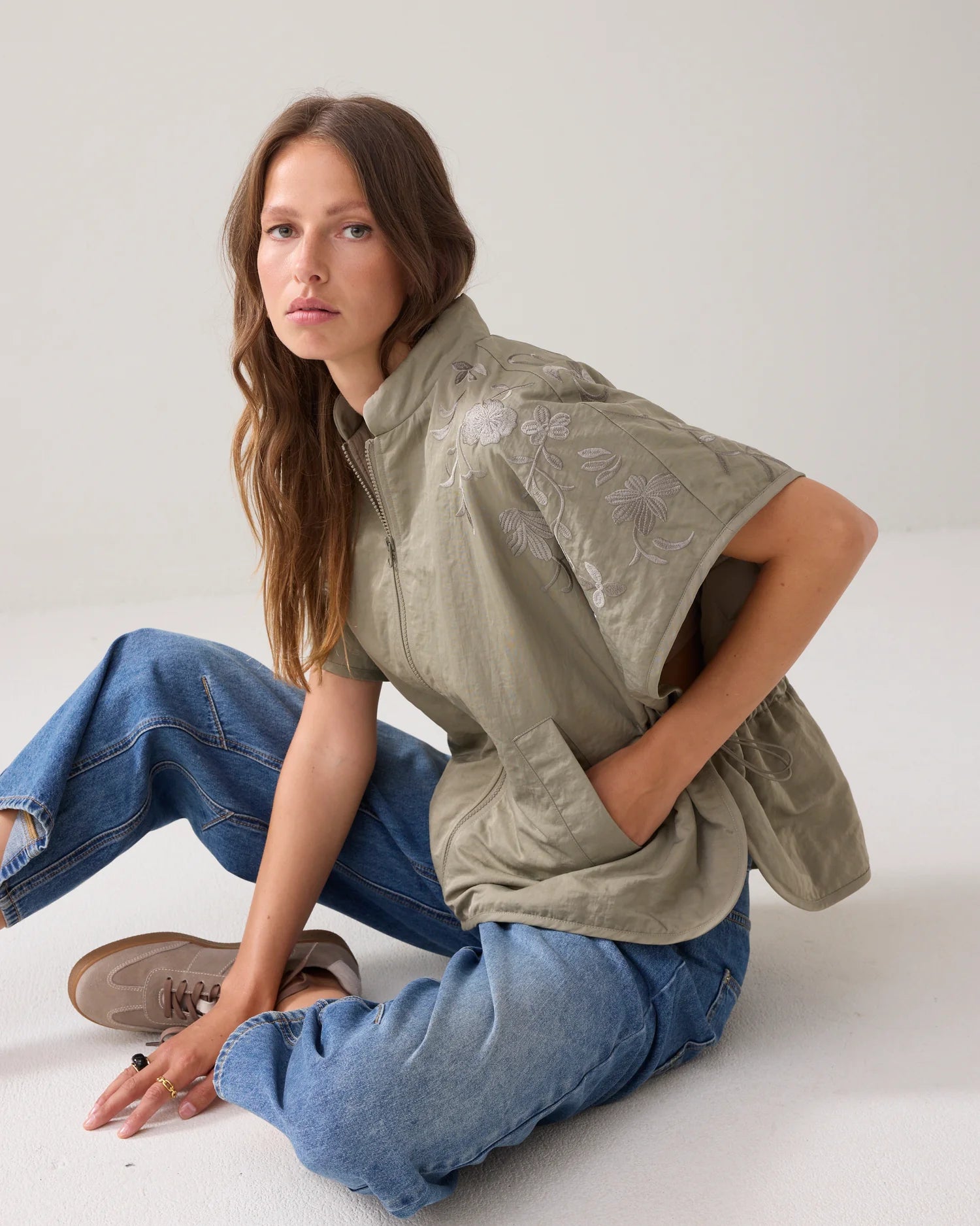 Foret og quiltet, er denne let skinnende vest lavet af et robust stof. Vesten er rigt dekoreret med ton-i-ton broderi på skuldrene foran og bagpå. Den elastiske talje kan justeres efter behov. Ser flot ud over en blazer, jakke eller bluse.